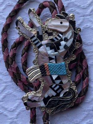 A gorgeous Zuni Pony horse bolo with matching tips available. Eldred Martinez like his Grandfather Leo Poblano is ahead of his time with design and artistic creation. Today we have this stunning sterling silver horse Zuni Pony bolo tie with a Pink Shell Zuni Pony. This incredible Pink Shell horse is adorned and inlaid with white shell, turquoise, and Acoma black jet along with matching tips. This beautiful Zuni Pony measures over 4 inches long with gorgeous matching tips. Signed by the master silversmith himself Eldred Martinez Zuni Pony Zuni, NM