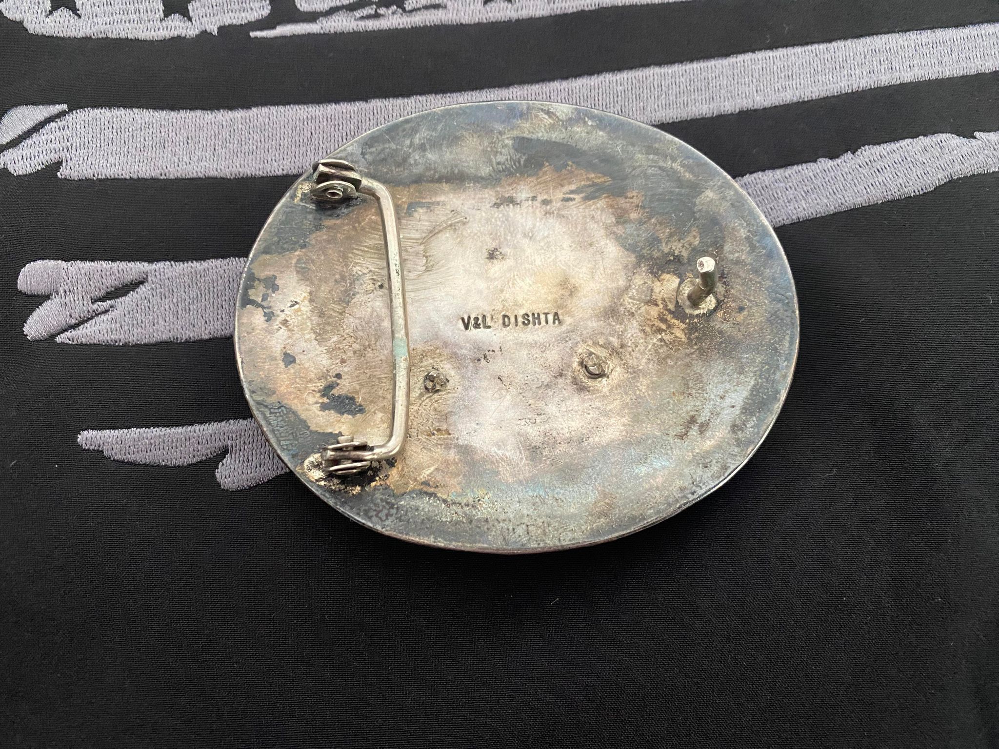 Zuni V & L Dishta Signed Inlay Sterling Silver Conestoga Wagon Belt Buckle with Moving Wheels/