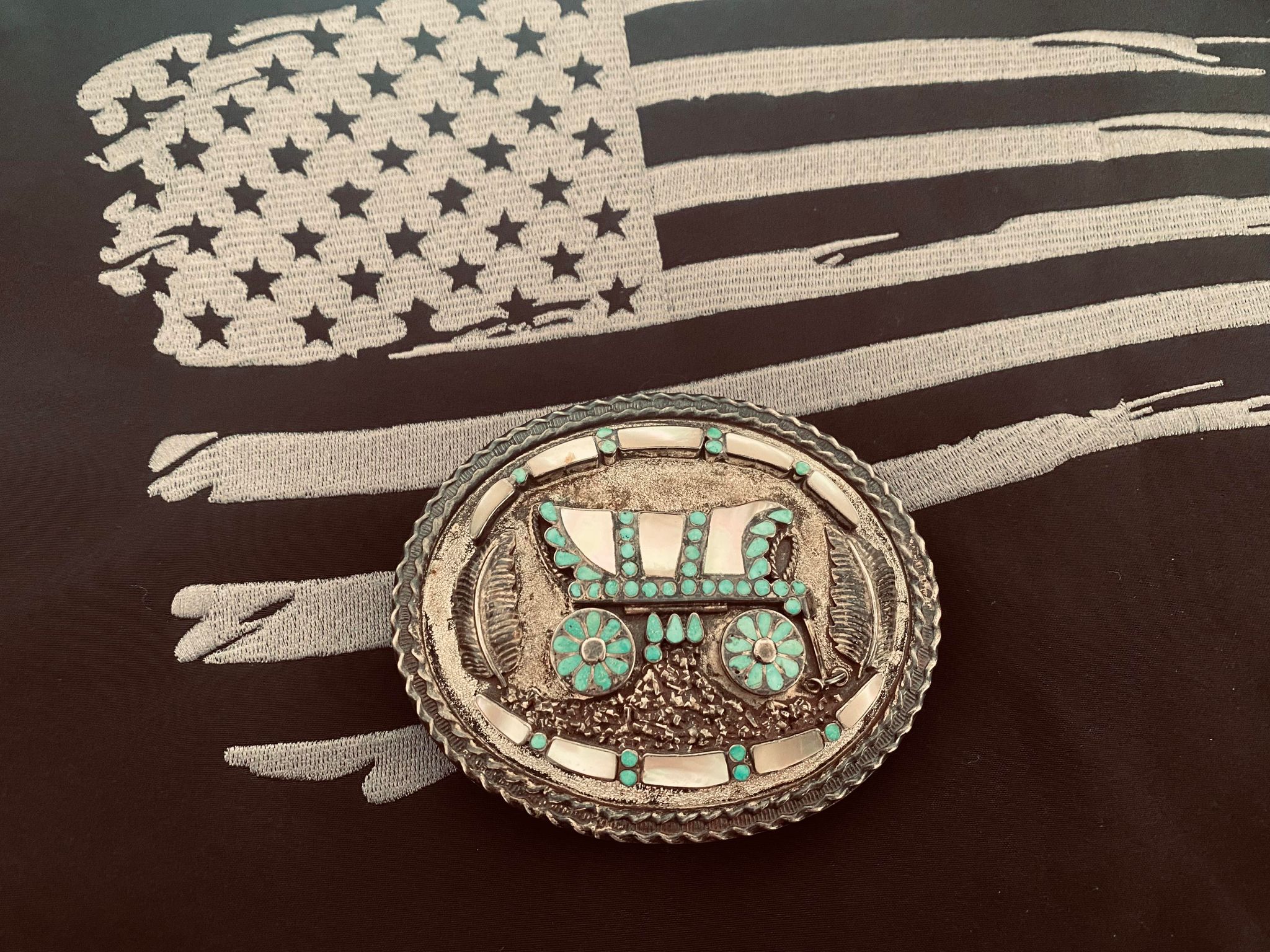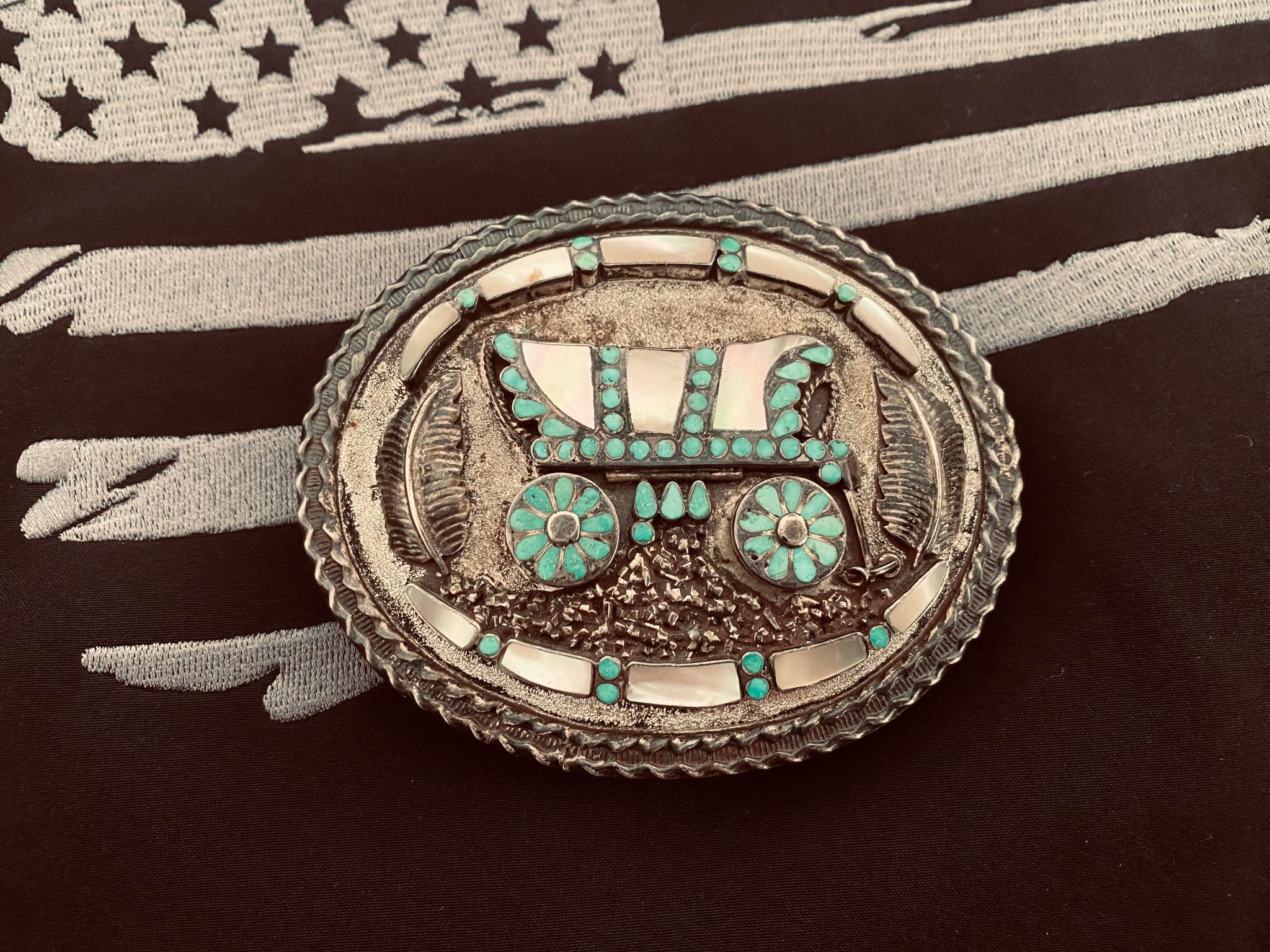 Stunning one of a kind buckle with moving wagon wheels and gorgeous hand made feathers. Beautiful sterling silver inlay Zuni Conestoga Wagon belt buckle created and signed by Zuni master silversmiths Virgil and Lena Dishta. This belt buckle measures 3.4 inches long, is sterling silver, signed and incredibly well made with incredibly beautiful turquoise and mother of pearl inlay. Signed V & L Dishta